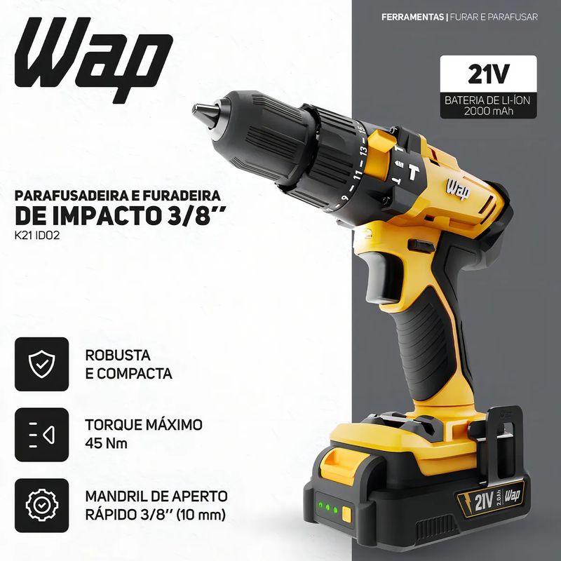 "Parafusadeira e Furadeira de Impacto 3/8"" WAP K21 ID02 2000 mAh" REF: 919953_Sicredi