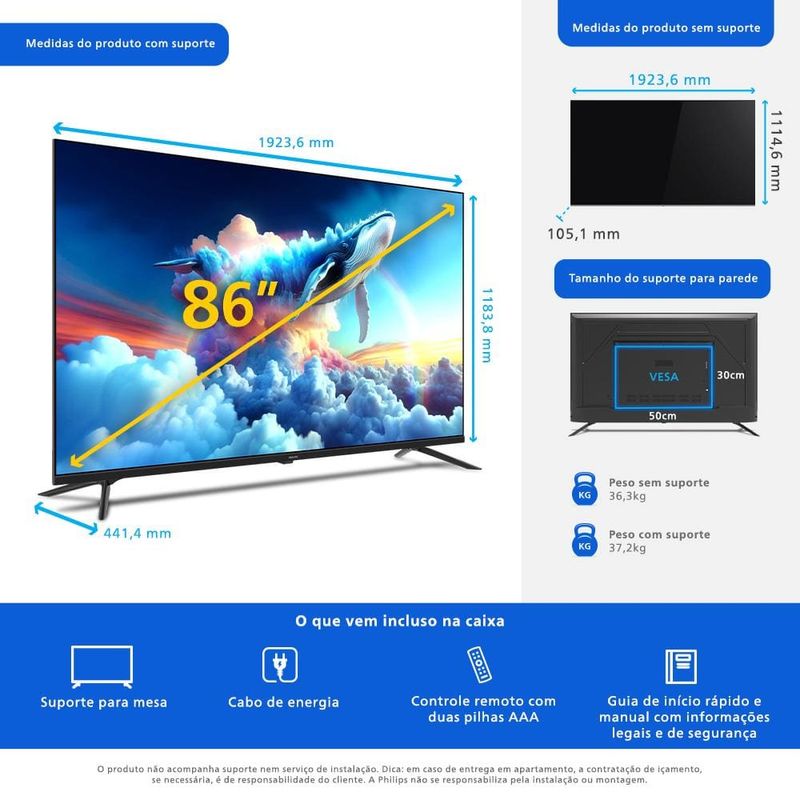 "Smart TV LED 86"" Ultra HD 4K Philips 86PUG7019/78 com Google TV, Comando de Voz, Wi-Fi, Entradas HDMI e USB" REF: 7898620272661