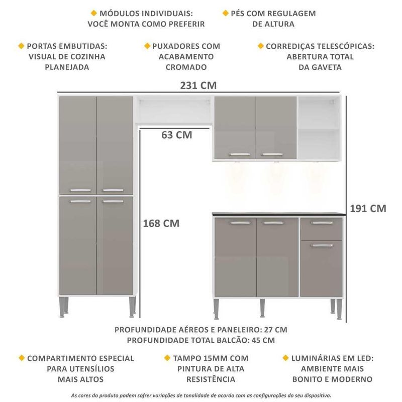 Casa e DecoraçãoMóveisCozinhasArmário de Cozinha Compacta Multimóveis Xangai FG3415 com 3 Leds e Balcão Branca/Lacca Fumê