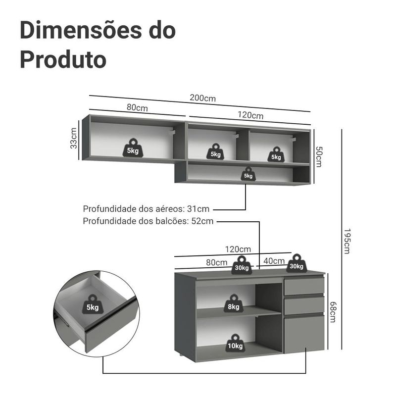 Casa e DecoraçãoMóveisCozinhasArmário de Cozinha Compacta Suspenso 200cm Cinza Nice Madesa 11