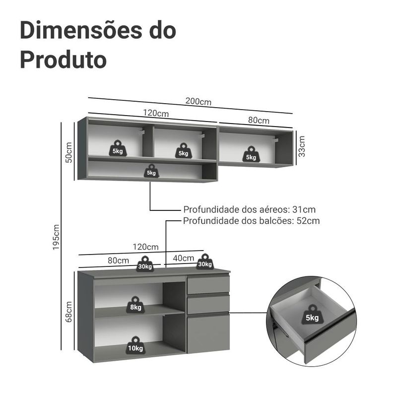 Casa e DecoraçãoMóveisCozinhasArmário de Cozinha Compacta Suspenso 200cm Cinza Nice Madesa XA11