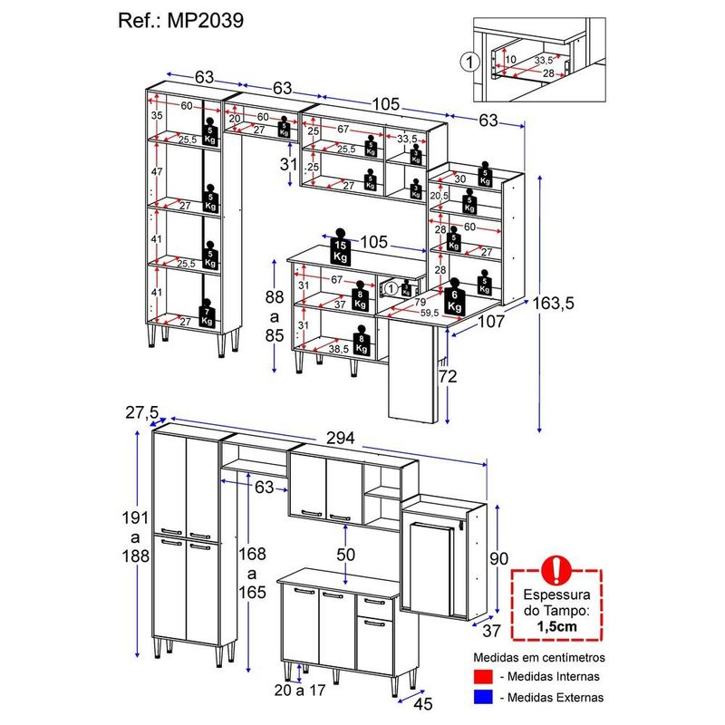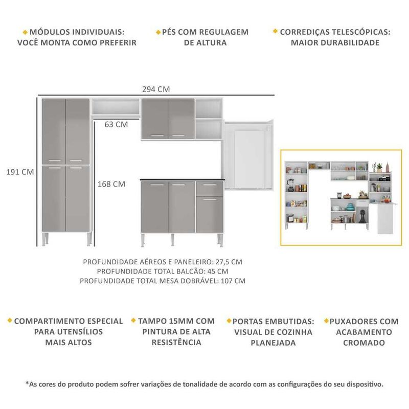Armário de Cozinha Completa com Mesa Dobrável Siena Multimóveis MP2039 Branca/Lacca Fumê REF: 7909103623488