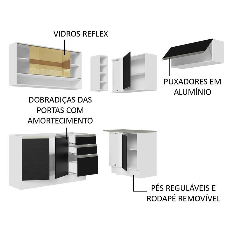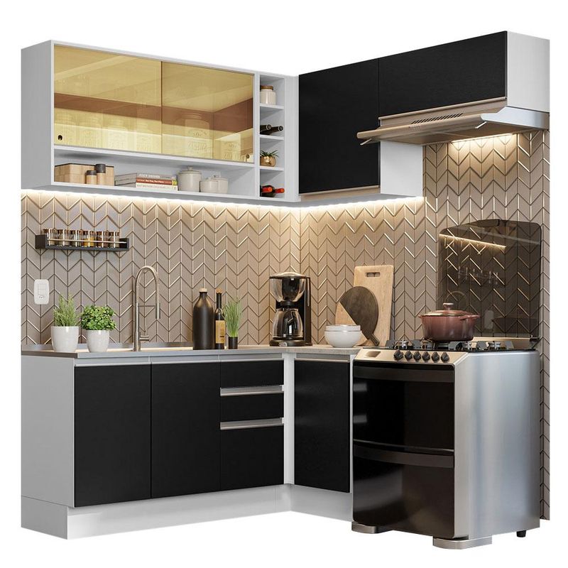 Armário de Cozinha Completa de Canto 349cm Branco/Preto Glamy Madesa 06 REF: 512663_Sicredi