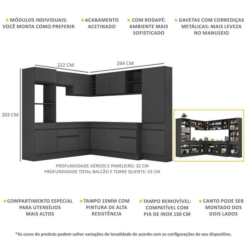 Armário de Cozinha Completa de Canto com Rodapé Veneza Multimóveis MP2082.895 Preto REF: 771613_Sicredi