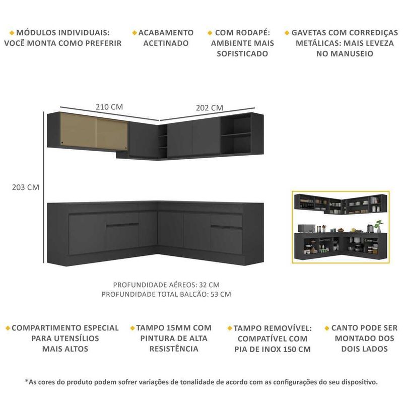 Armário de Cozinha Completa de Canto com Rodapé Veneza Multimóveis MP2096.895 Preto REF: 569109_Sicredi