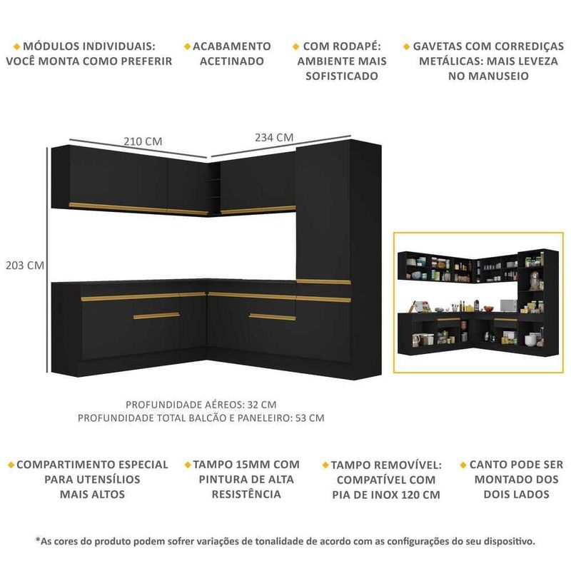 Armário de Cozinha Completa de Canto com Rodapé Veneza Multimóveis MP2101 Preta REF: 769656_Sicredi