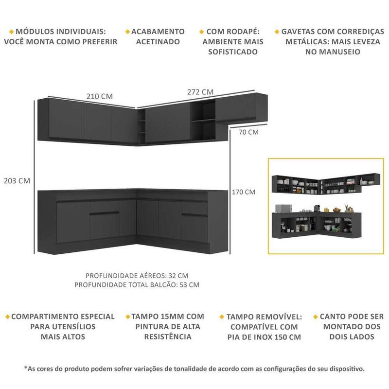 Armário de Cozinha Completa de Canto com Rodapé Veneza Multimóveis MP2103.895 Preto REF: 568337_Sicredi