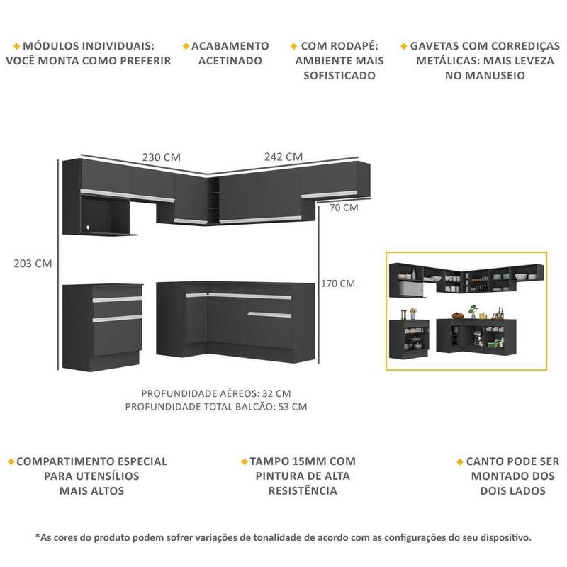 Armário de Cozinha Completa de Canto com Rodapé Veneza Multimóveis MP2106.898 Preto/Branco REF: 766482_Sicredi
