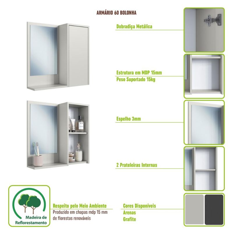Armário Espelheira de Banheiro 60 Bologna com 1 Porta Grafite REF: 7899766517913