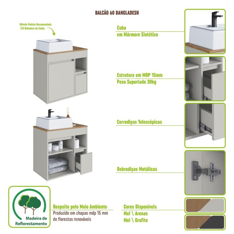 Casa e DecoraçãoMóveisBalcão e GabineteBalcão Gabinete de Banheiro Suspenso 60 Bangladesh 1 Porta e 1 Gaveta Grafite com Cuba Branca