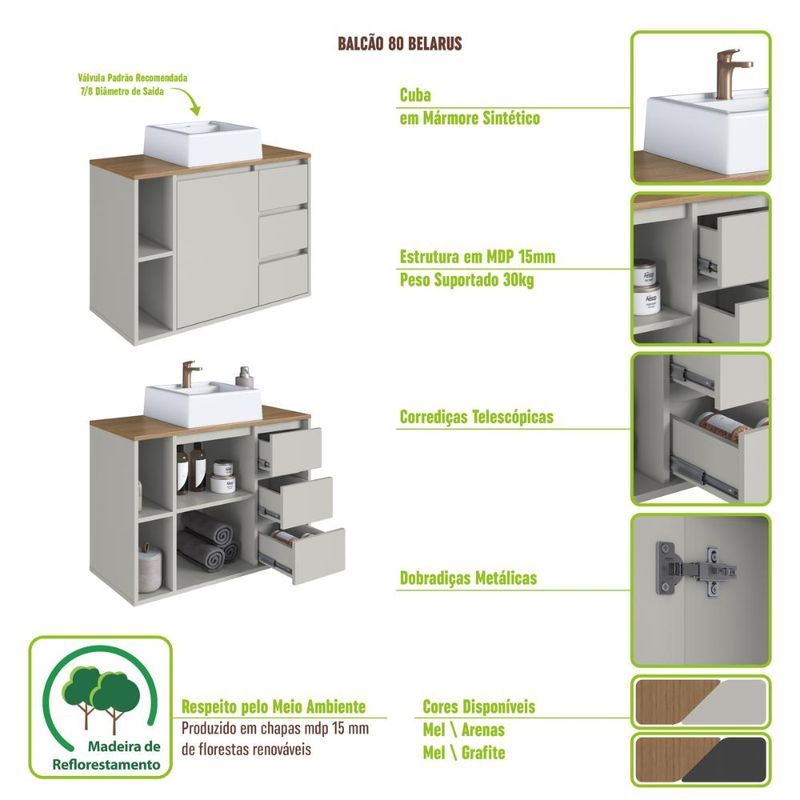 Balcão Gabinete de Banheiro Suspenso 80 Belagavi 1 Porta 3 Gavetas e Nichos Arenas com Cuba Branca REF: 7899766518149