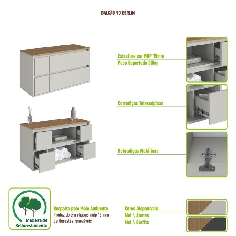 Balcão Gabinete de Banheiro Suspenso 90 Berlim com 2 Portas e 4 Gavetas Arenas REF: 7899766518163