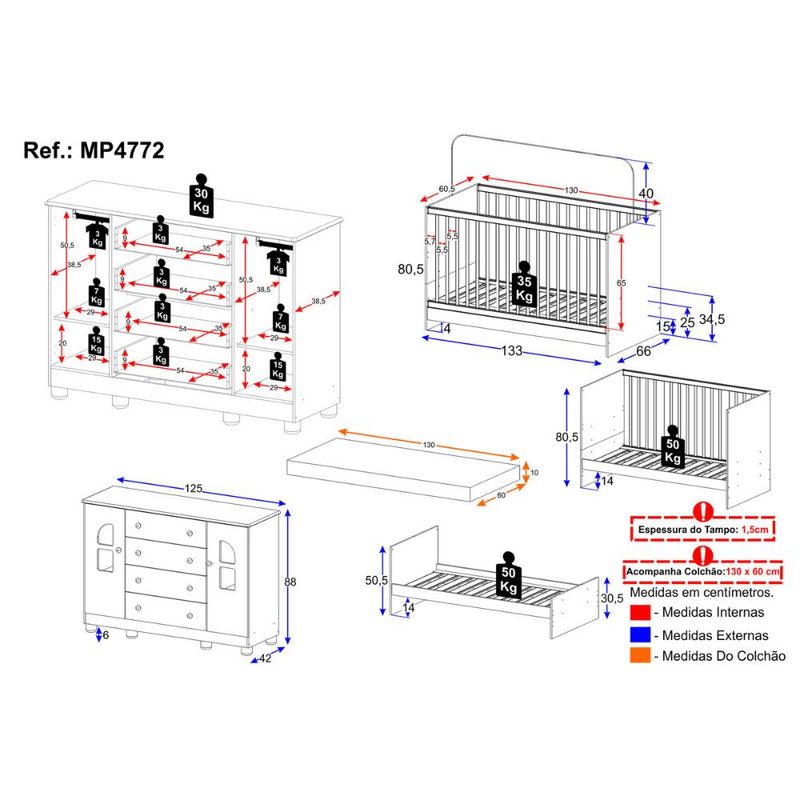 Berço 3 em 1 com Colchão Incluso e Cômoda 2 Portas 4 Gavetas Nina Multimóveis MP4772 REF: 7899390842757