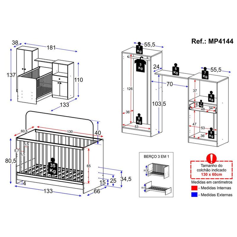 Casa e DecoraçãoMóveisBerço e ColchãoBerço 3 em 1 e Guarda-Roupas 4 Portas 1 Gaveta Multimóveis MP4144