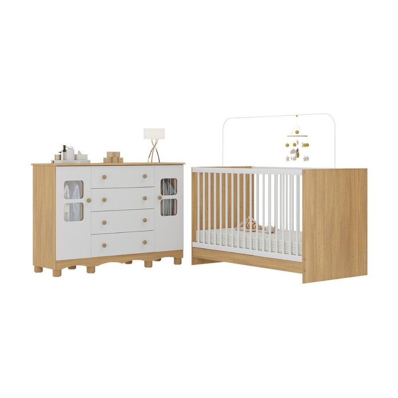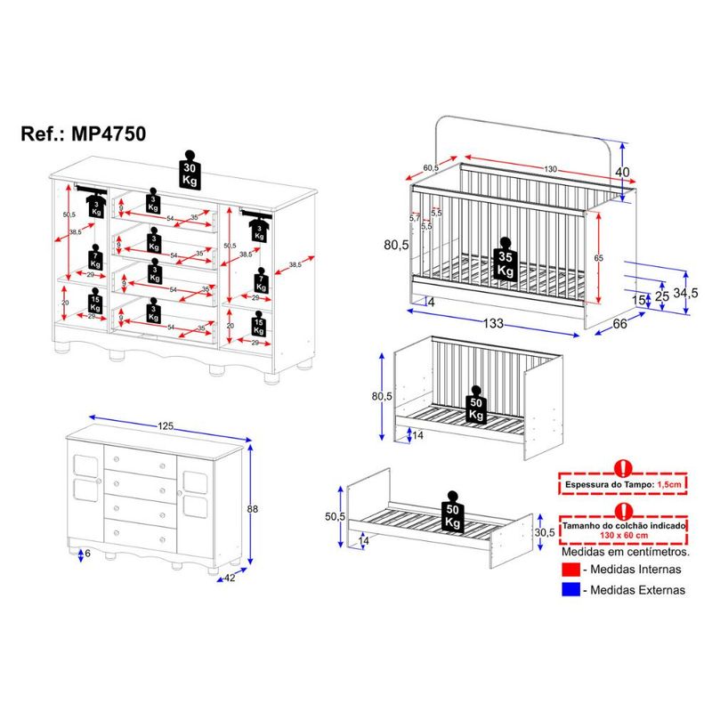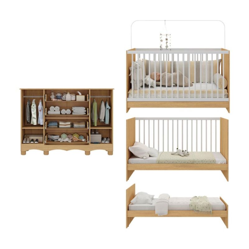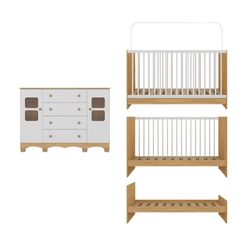 Casa e DecoraçãoMóveisBerço e ColchãoBerço 3 em 1 para Colchão 130x60cm com Cômoda 2 Portas 4 Gavetas Luna Multimóveis MP4750