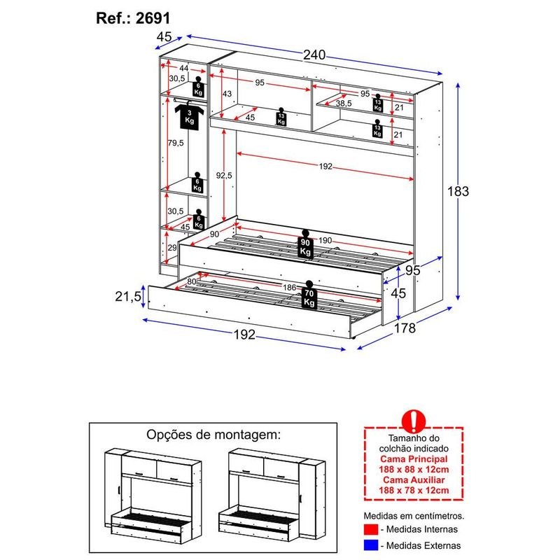 Casa e DecoraçãoMóveisCamaBicama com Guarda-Roupas/Roupeiro para colchão 88 x 188 cm Multimóveis Branca