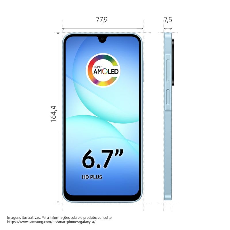 Eletrônicos e TecnologiaTelefoniaSmartphonesCelular Samsung Galaxy A17 4G Tela 6.7" 128GB Super AMOLED Câmera Tripla 50MP Azul
