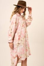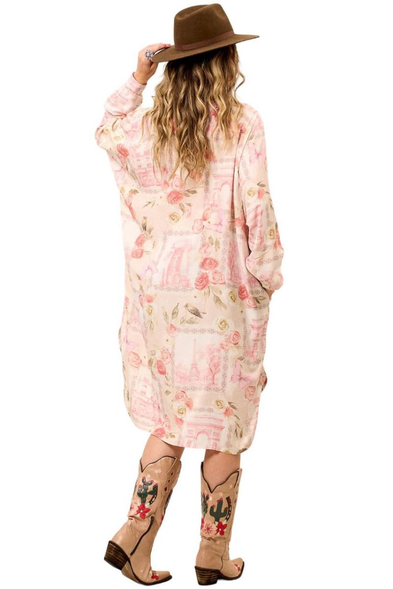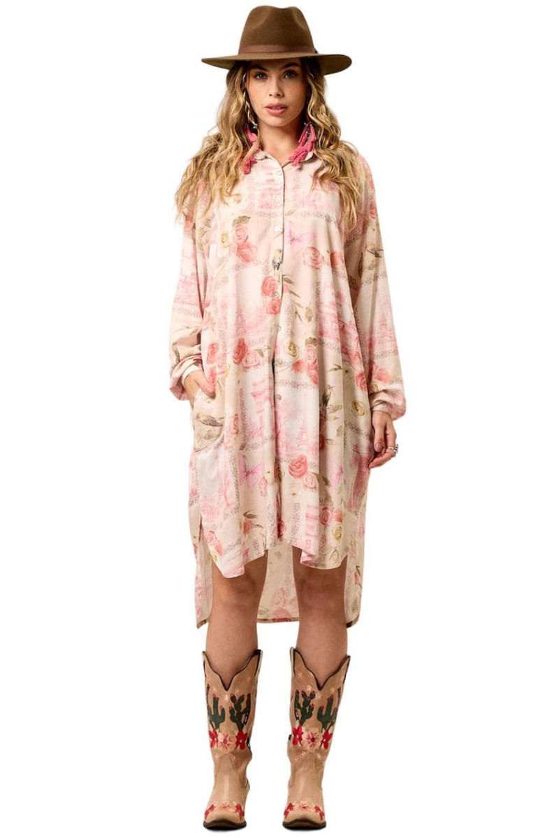 Chemise Amplo Alongado Com Mangas Longas Bege Estampado Yacamim M9 REF: 742599_Sicredi
