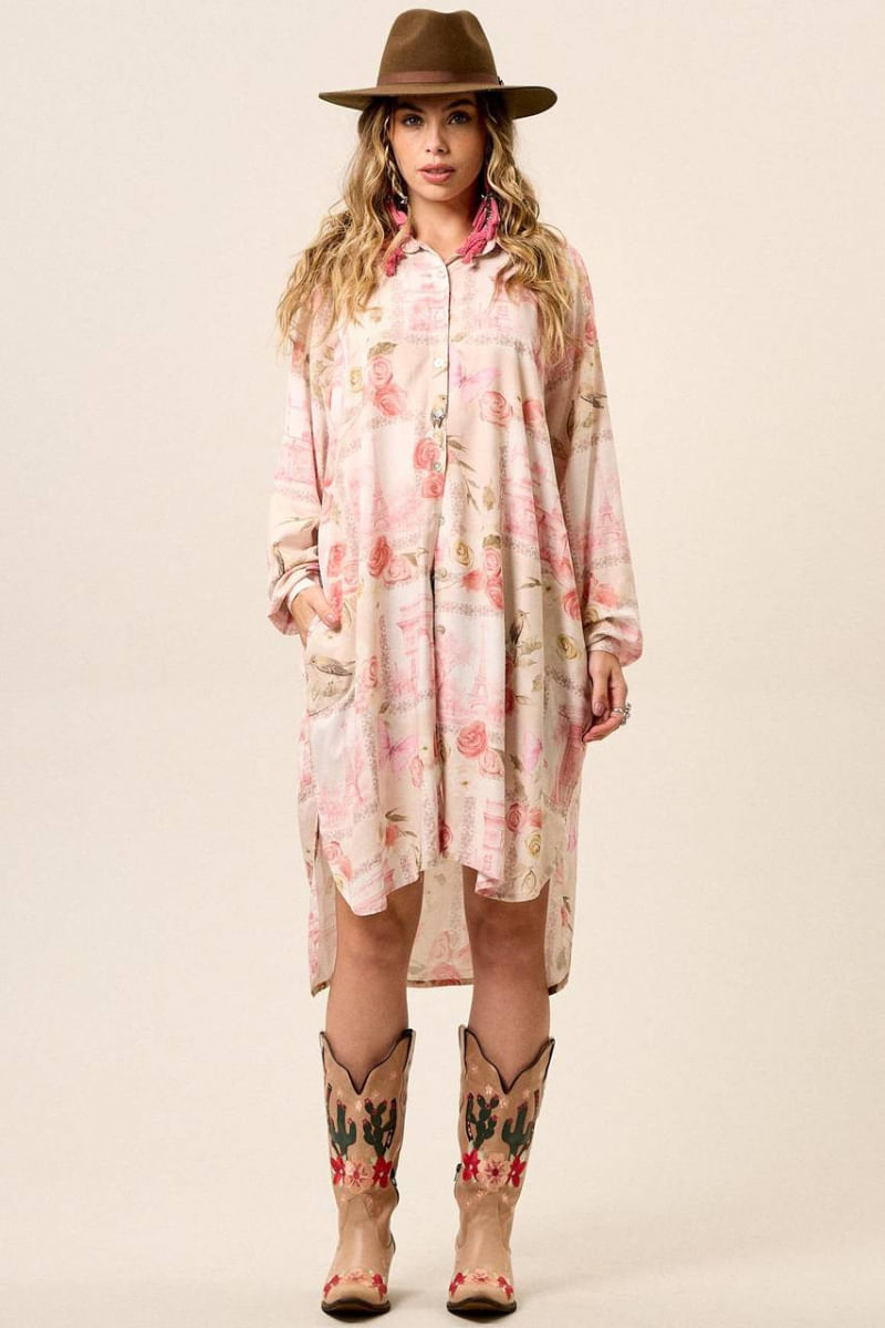ModaFemininoBlusas e CamisetasChemise Amplo Alongado Com Mangas Longas Bege Estampado Yacamim M9