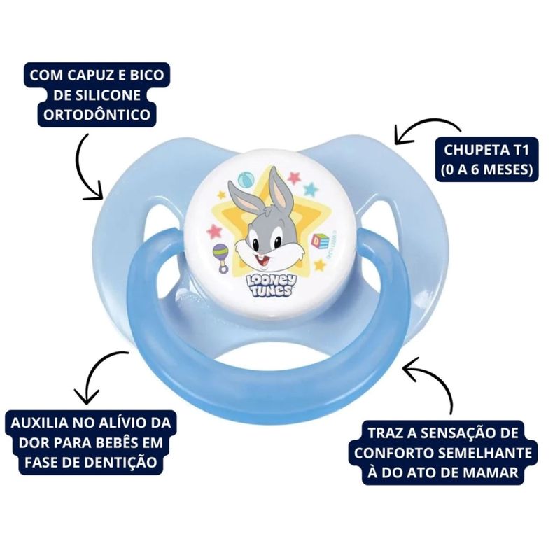 CHUPETA BABY GO FASE 2 COM CAPUZ SILICONE ORTO LOONEY TUNES AZUL REF: 757973_Sicredi