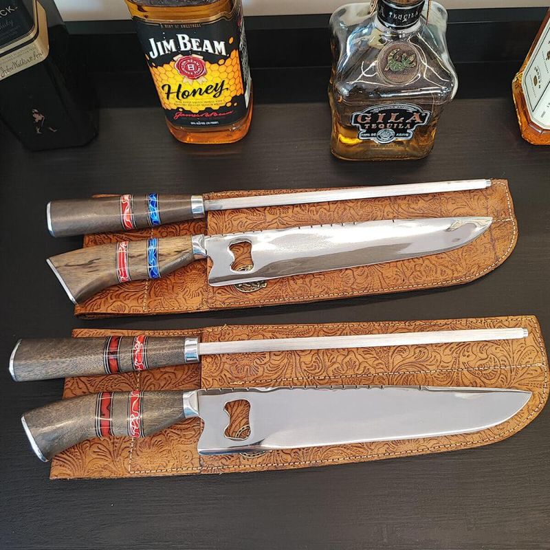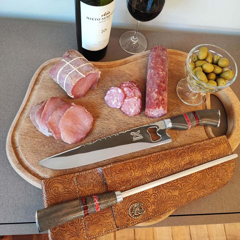 Conjunto Faca Abridor e Chaira 10' Churrasco Artesanal Cabo Madeira Imbuia Aço Inox Tradicional REF: 7798137852410