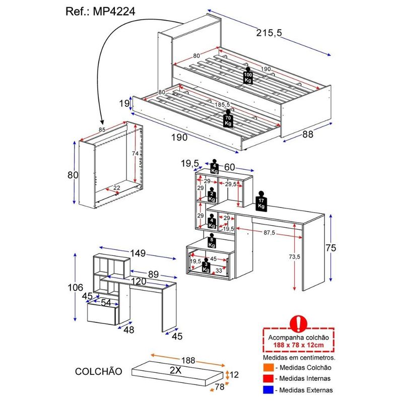 Casa e DecoraçãoMóveisCamaConjunto Quarto Bicama com Colchão e Baú/Escrivaninha Multimóveis MP4224