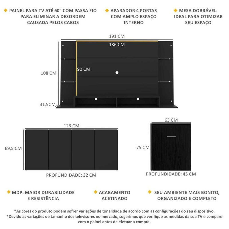 Casa e DecoraçãoMóveisRack e painel de TVConjunto Sala de Estar Painel TV 60" / Aparador / Mesa Dobrável Lara Multimóveis Preto