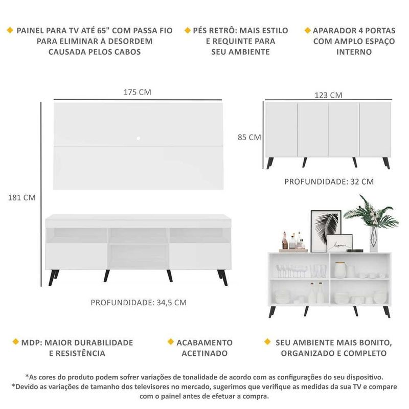 Conjunto Sala de Estar Rack + Painel TV 65" e Aparador Retrô Sofia Multimóveis Branco/Preto REF: 762886_Sicredi