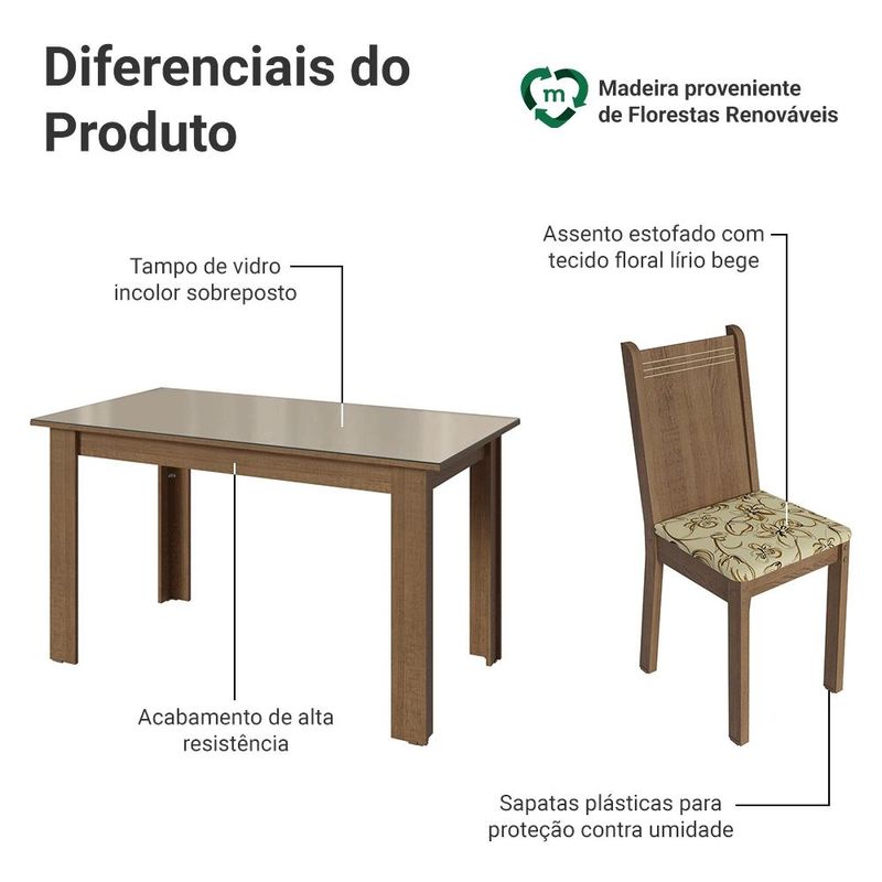 Conjunto Sala de Jantar Avelã Mesa Tampo de Vidro 4 Cadeiras Rustic/Crema/Lírio Bege Madesa REF: 7891760181084