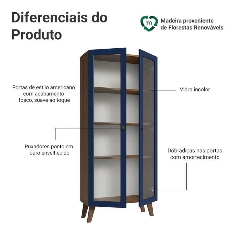 Cristaleira 70 cm 2 Portas de Vidro com Pés Trapézio Rustic/Azul/Rustic Vik Madesa REF: 7891760967350