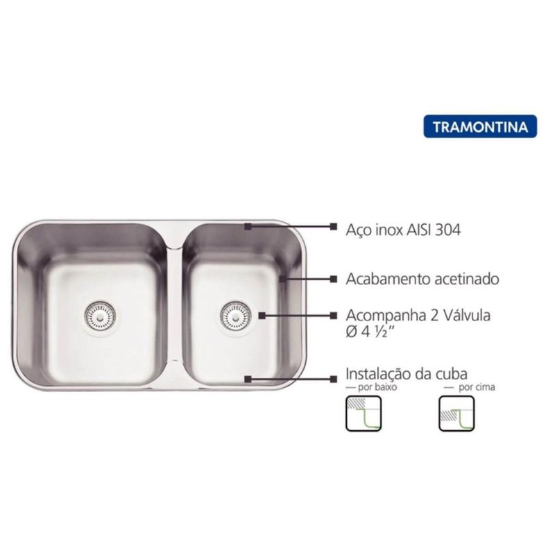 Ferramentas e ConstruçãoConstruçãoCubas e PiasCuba Dupla Embutir ou Sobrepor Tramontina Aço Inox 16L e 12L Acabamento Escovado