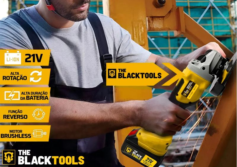 Ferramentas e ConstruçãoFerramentasFerramentas elétricasEsmerilhadeira Angular Profissional Brushless 9000 Rpm 21V 2 Baterias The Black Tools - BIVOLT