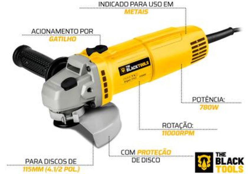 Ferramentas e ConstruçãoFerramentasFerramentas elétricasEsmerilhadeira Lixadeira Angular 4.1/2 11000rpm 780w The Black Tools Cor Amarelo Com 2 Discos De Corte