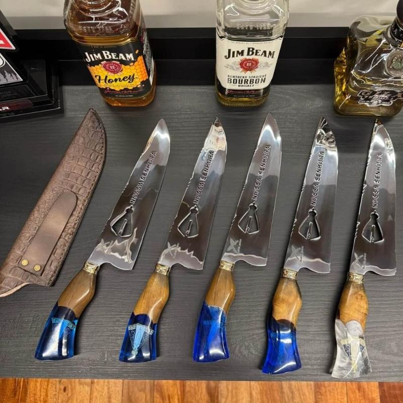 Casa e DecoraçãoUtilidades DomésticasUtensílios de ChurrascoFaca Picanheira 10' Artesanal Híbrida Nossa Senhora Aparecida Inox 3mm Artesanal