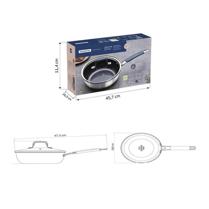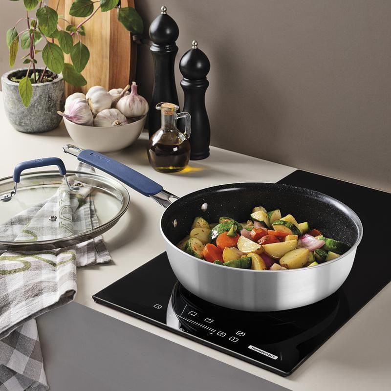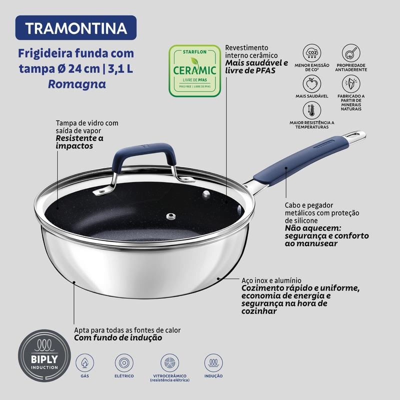 Casa e DecoraçãoUtilidades DomésticasAcessórios de CozinhaFrigideira Tramontina Funda com Tampa Romagna em Aço Inox e Alumínio com Revestimento Cerâmico Black Stone 24cm