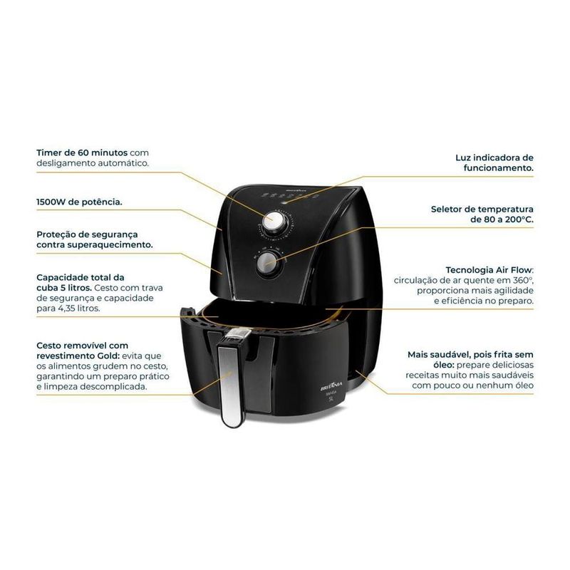 Fritadeira Elétrica Air Fryer Britânia BAF45A Revestimento Antiaderente Gold 5L Preta REF: 7891356123641
