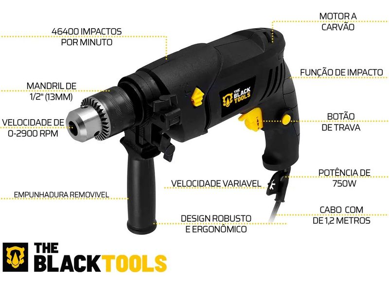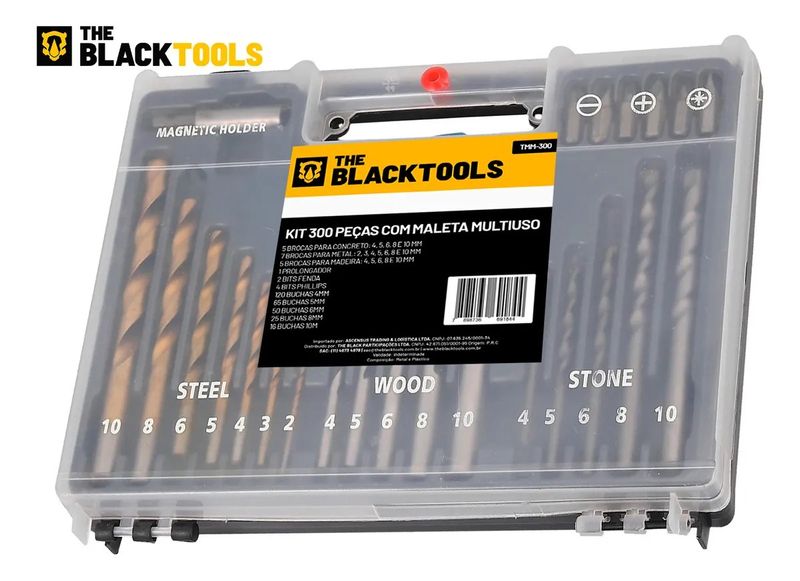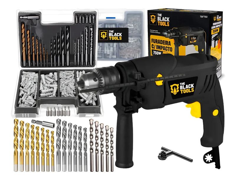 Furadeira De Impacto 13mm 750w Profissional Com Kit Brocas Buchas E Bits 300 Peças The Black Tools REF: 883490_Sicredi