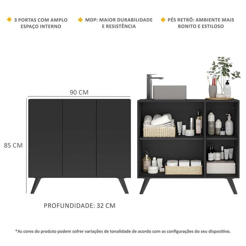 Casa e DecoraçãoMóveisArmário de BanheiroGabinete Banheiro 3 Portas Retrô 90cm Multimóveis MP5030 Preto