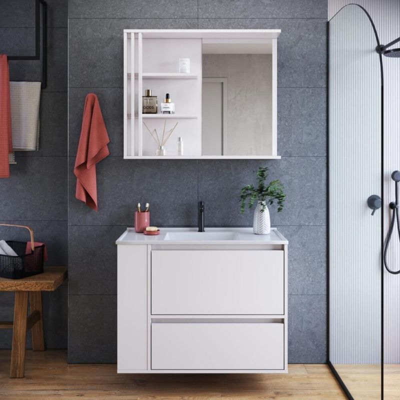 Casa e DecoraçãoMóveisBalcão e GabineteGabinete De Banheiro 80cm Estela Branco Lavatório Espelheira com 1 Gavetão E Basculante