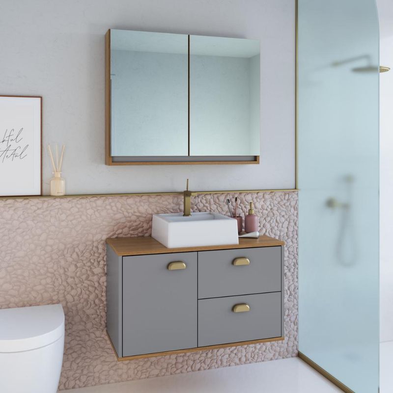 Casa e DecoraçãoMóveisBalcão e GabineteGabinete De Banheiro 80Cm Lívia 100% Mdf Com Espelheira 2 Portas Freijo/Urbi Com Cuba Branca