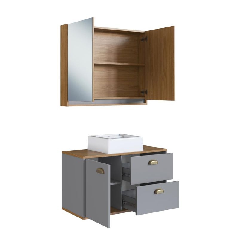 Gabinete De Banheiro 80Cm Lívia 100% Mdf Com Espelheira 2 Portas Freijo/Urbi Com Cuba Branca REF: 7898744952562