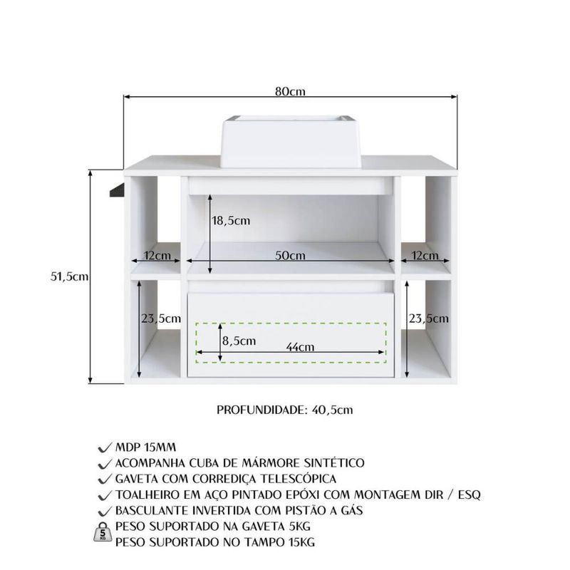 Gabinete de Banheiro Suspenso 80cm com Cuba Branco 4 Nichos 1 Toalheiro 2 Gavetas REF: 7898758440550