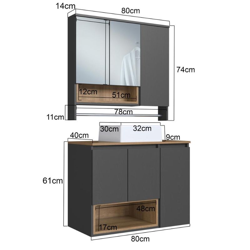 Casa e DecoraçãoMóveisBalcão e GabineteGabinete Suspenso Olívia Mel Grafite Cuba Espelheira Nicho Toalheiro e 3 Portas 80cm