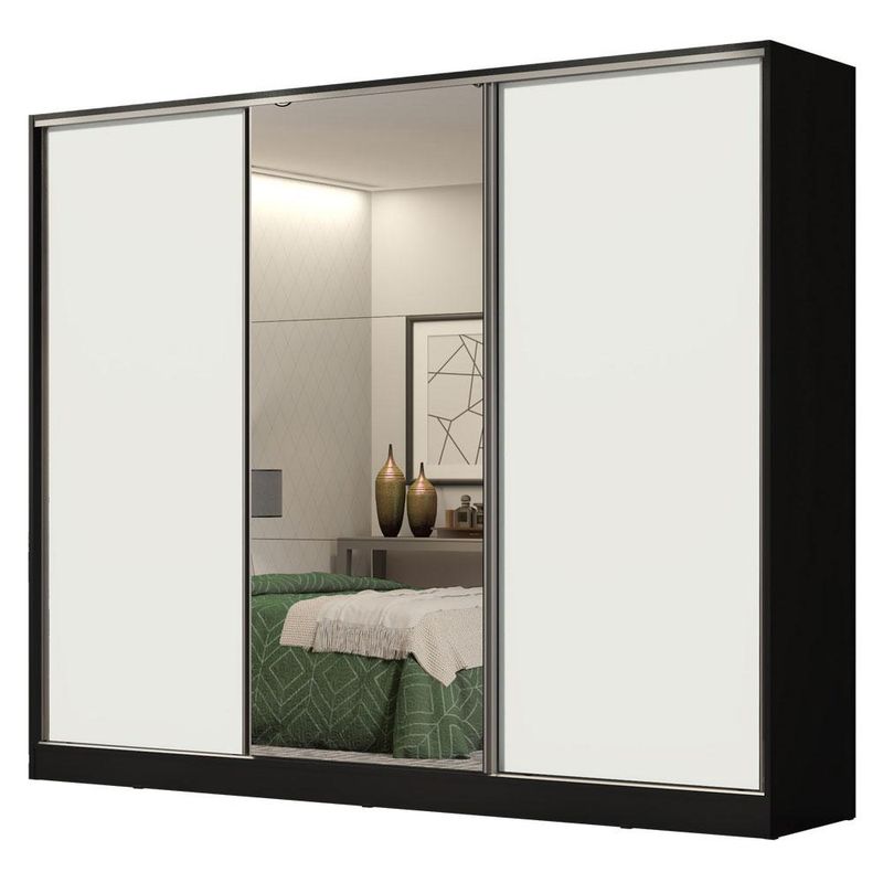 Guarda Roupa Casal 100% MDF Madesa Royale 3 Portas de Correr com Espelho - Preto/Branco REF: 511074_Sicredi