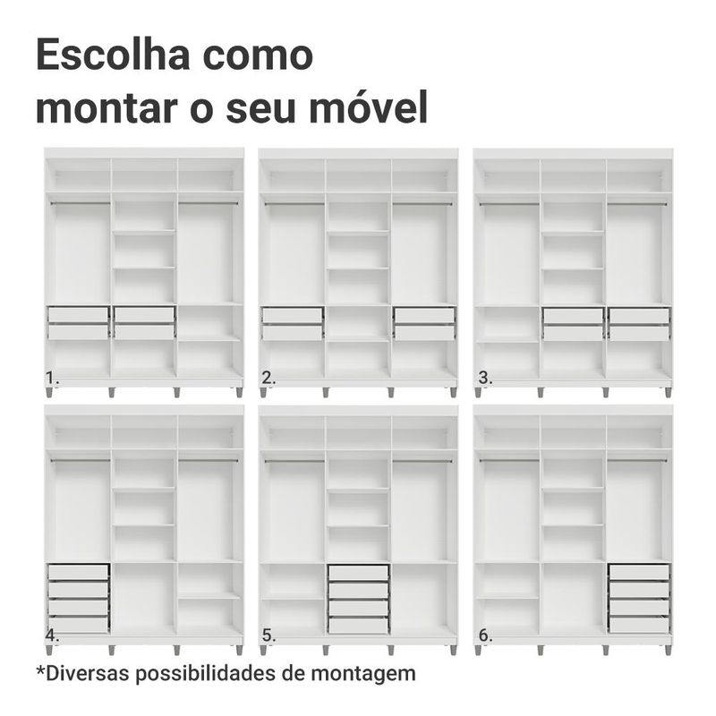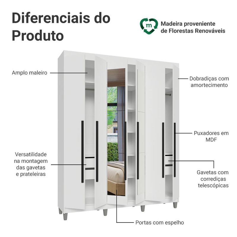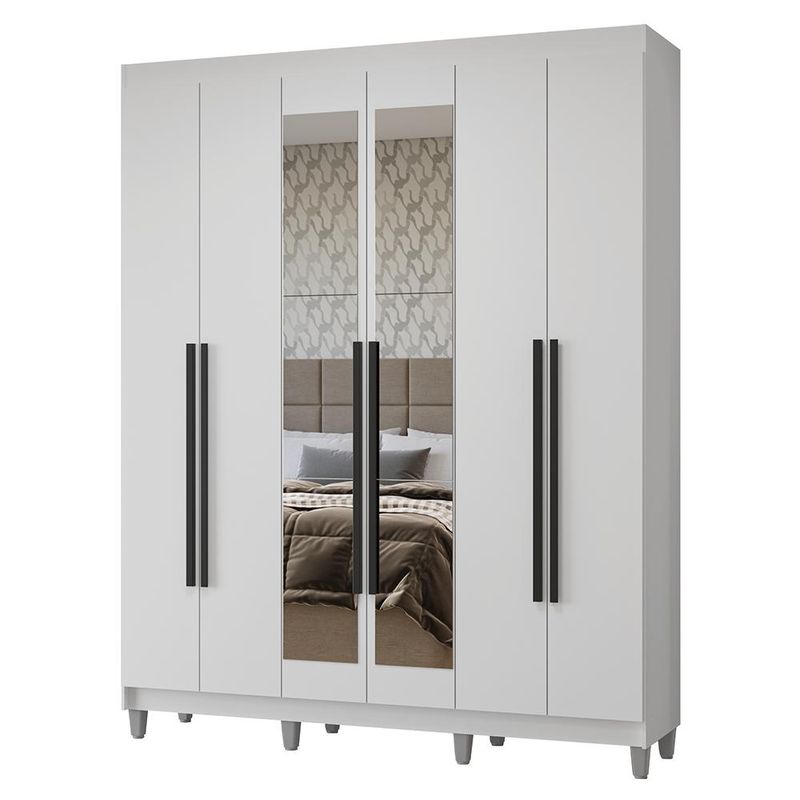 Casa e DecoraçãoMóveisGuarda-roupa e roupeirosGuarda-Roupa Casal com Pés 6 Portas Batentes com Espelho Branco/Branco/Preto Netuno Madesa