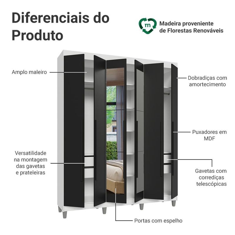 Casa e DecoraçãoMóveisGuarda-roupa e roupeirosGuarda-Roupa Casal com Pés 6 Portas Batentes com Espelho Branco/Preto/Preto Netuno Madesa