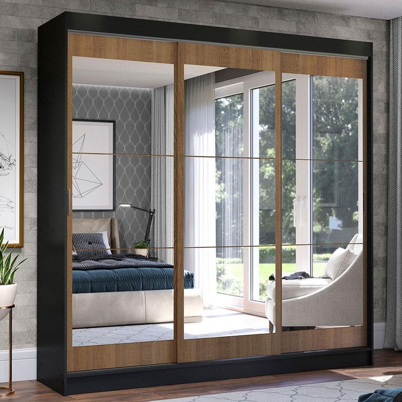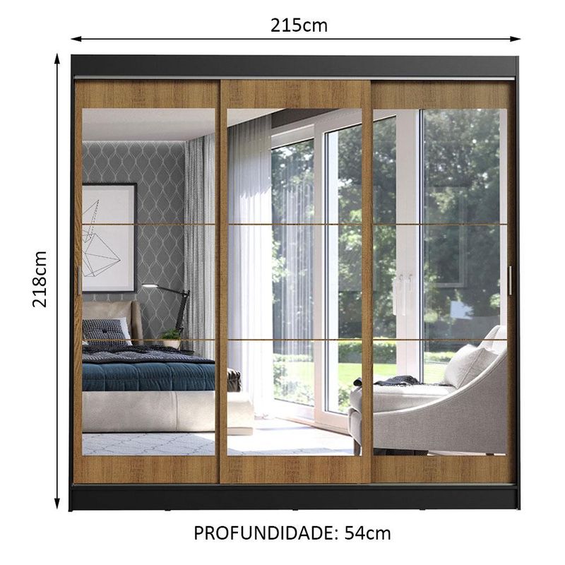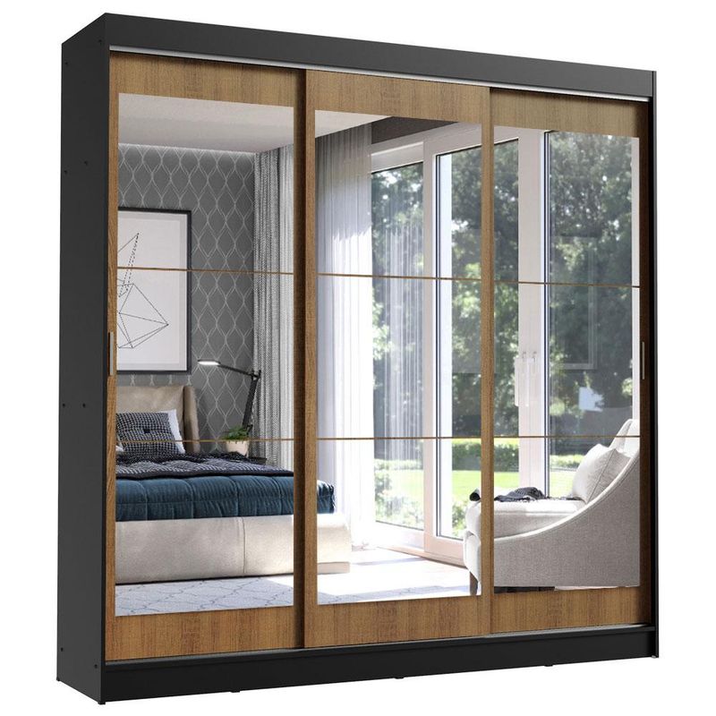 Guarda-Roupa Casal Madesa Istambul 3 Portas de Correr de Espelho 3 Gavetas - Preto/Rustic REF: 511266_Sicredi