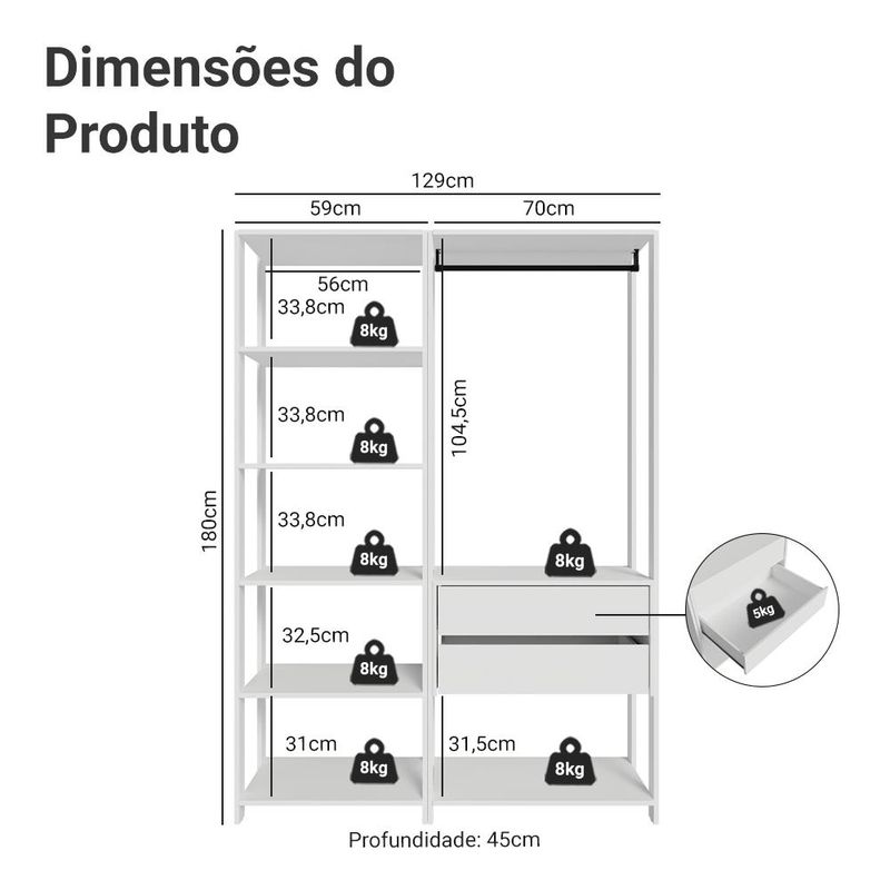 Casa e DecoraçãoMóveisGuarda-roupa e roupeirosGuarda-Roupa Closet Modulado 2 Gavetas 129 cm Branco Valencia Madesa
