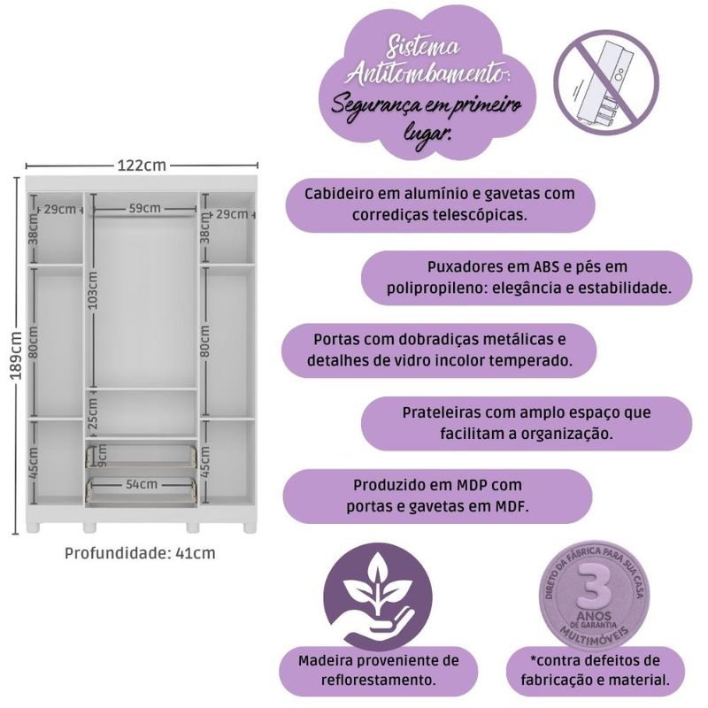 Casa e DecoraçãoMóveisGuarda-roupa e roupeirosGuarda-roupa Infantil 122cm com Vidro 4 Portas e 2 Gavetas Sol Multimóveis MP4420