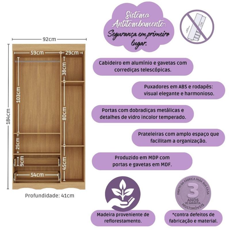 Casa e DecoraçãoMóveisGuarda-roupa e roupeirosGuarda-roupa Infantil 92cm com Vidro 3 Portas e 2 Gavetas Serena Multimóveis MP4431
